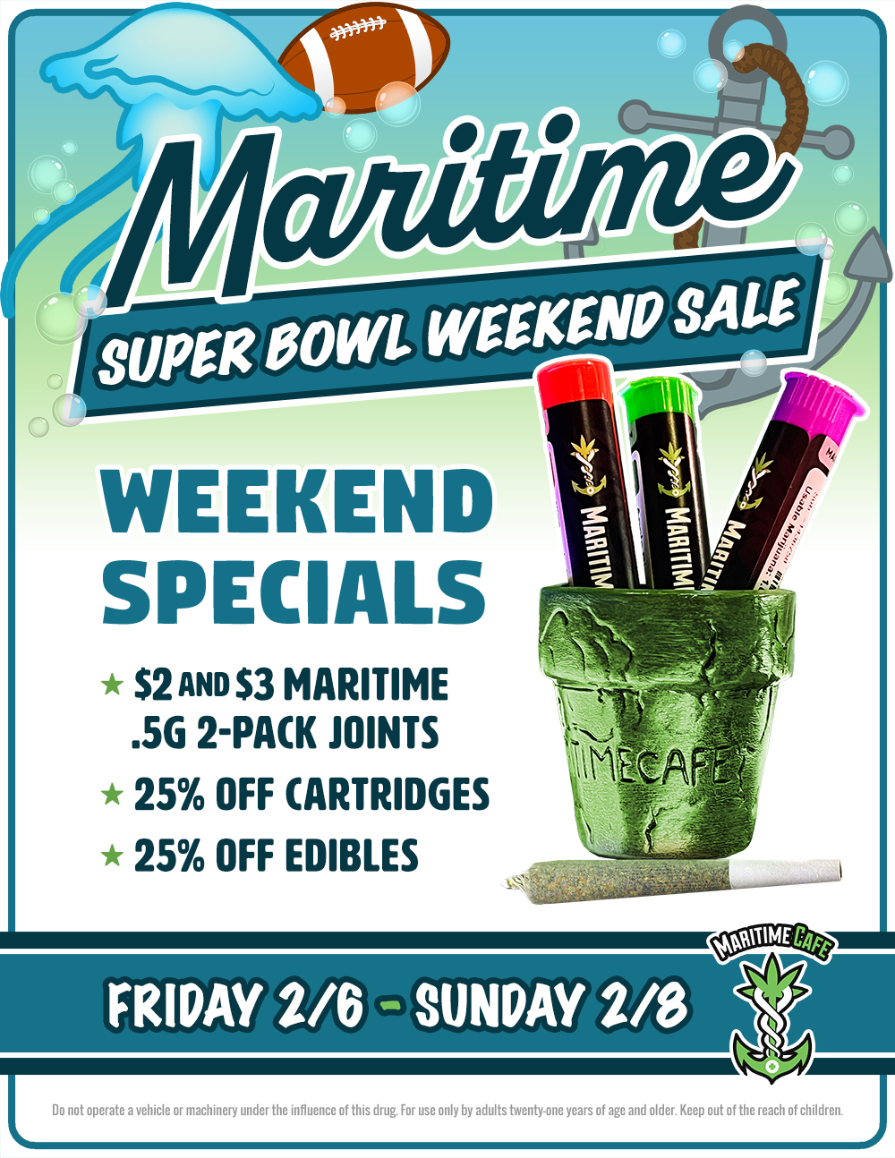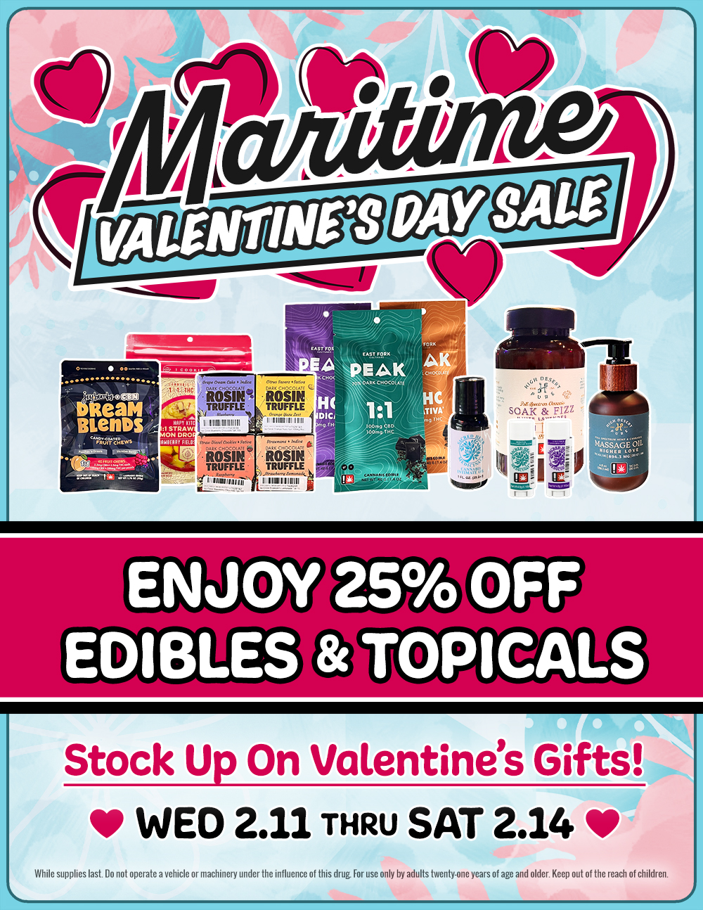 Love is in the air at Maritime Cafe! Treat yourself (or someone special) during our Valentine’s Day Sale, running Wednesday, February 11th through Saturday, February 14th. Enjoy 25% off edibles and topicals, perfect for gifting, sharing, or indulging solo. Stock up on sweet treats, soothing goodies, and Valentine-ready favorites while supplies last—it’s the perfect way to spread the love. 💕